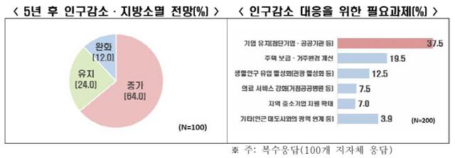 향후 전망은 더 부정적이다. 10곳 중 6곳 이상(64.0%)은 향후 5년 뒤 인구 감소·지방 소멸 위험이 지금보다 높아질 것으로 예상했다. 위험이 완화할 것이라는 응답은 12.0%에 불과했다.