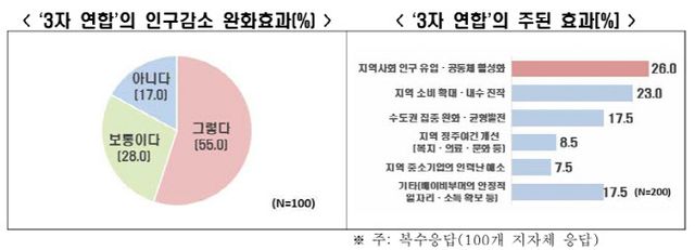 지방 소멸 대응책으로 제시된 ‘베이비부머 지역경제 붐업(Boom Up) 프로젝트’에 대해서는 긍정 평가가 많았다. 비수도권 지자체의 55.0%는 수도권 베이비부머의 지역 취업·귀촌을 연계하는 이른바 ‘3자 연합’(베이비부머-지역 중소도시-지역 중소기업) 모델이 실질적인 도움이 될 것이라고 응답했다.