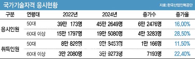 2년 전인 2022년만 해도 50대 응시자가 39만 173명, 60대 이상이 15만 1797명이었던과 비교하면 응시자수는 50대에서 16%(6만 2476명), 60대에서 28.5%(4만 3283명)증가했다.
