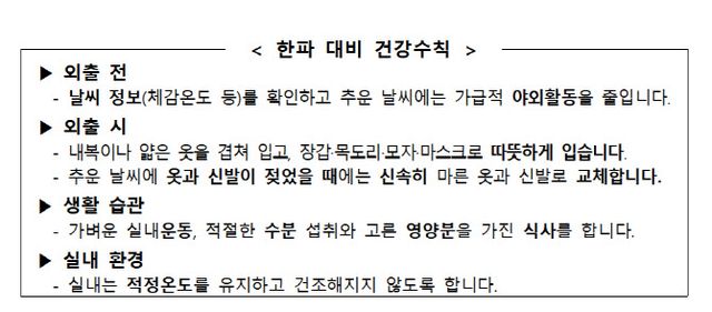임승관 질병관리청장은 “겨울철 외출시 방한복, 모자, 장갑 등 방한물품을 착용하고 특히 고령자와 치매 등 기저질환이 있는 경우 보호자의 세심한 관찰과 한랭질환 예방 건강수칙을 철저히 준수해 달라”고 당부했다.