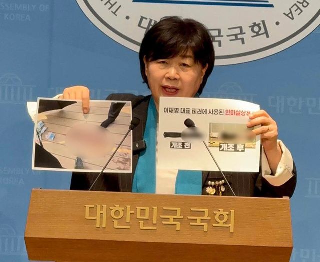 서영교 더불어민주당 의원이 기자회견에서 이재명 대통령을 공격할 때 쓰인 흉기를 담은 사진을 공개하고 있다. / 서 의원 페이스북