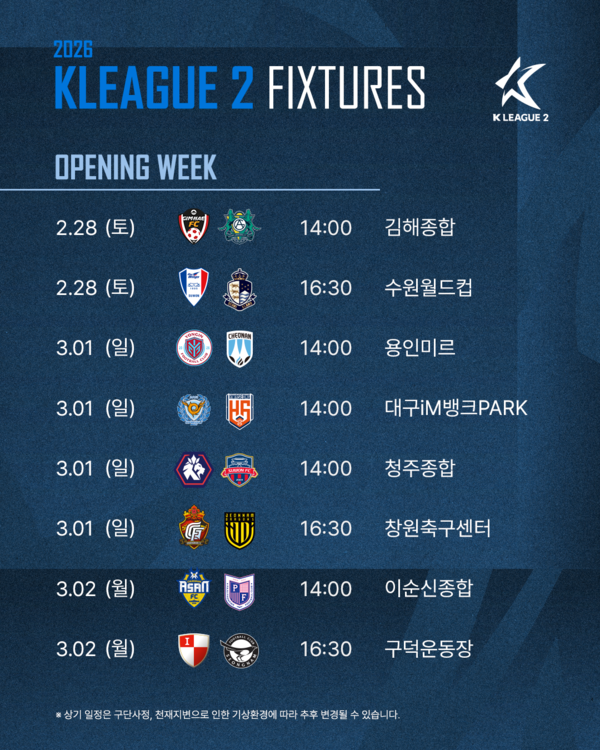 2026시즌 K리그2의 문을 여는 첫 번째 경기는 2월 28일 오후 2시 김해종합운동장에서 열리는 김해와 안산그리너스의 경기다. 지난해 K3리그 우승팀 김해는 올 시즌 프로 무대에 도전장을 내밀었고, 안산은 지난 시즌 부진을 씻고 중위권 도약을 노린다.