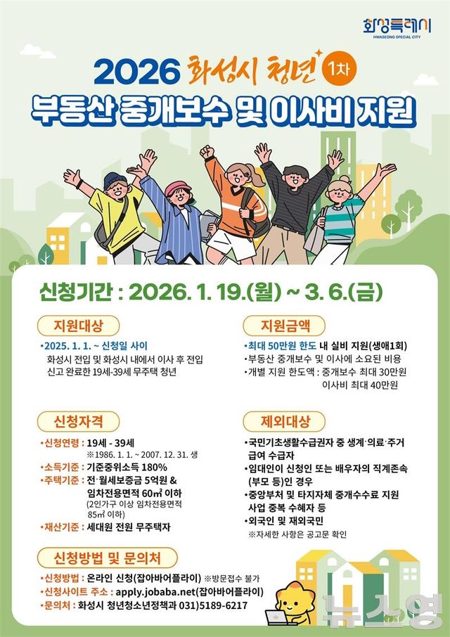(뉴스영 이현정 기자) 화성특례시가 19일부터 3월 6일까지 청년들의 주거비 부담 경감을 위한 '2026년 상반기 청년 부동산 중개보수 및 이사비 지원사업' 신청을 받는다고 19일 밝혔다.