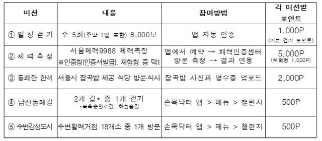 자신의 체력 상태를 객관적으로 점검할 수 있도록 ‘체력측정’ 미션도 포함했다. 손목닥터9988 앱을 통해 예약한 뒤 서울체력9988 체력인증센터를 방문해 체력을 측정하고 손목닥터9988 앱에 연동하면 최대 5000포인트를 지급한다.