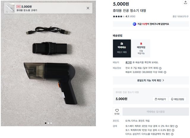 재입고 당일 택배 일시품절 상태인 휴대용 진공 청소기 / 다이소몰