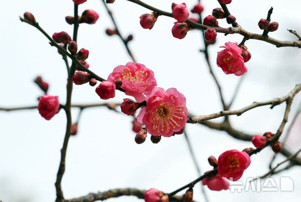 [서울=뉴시스] 일년 중 가장 춥다는 '대한'(大寒)을 하루 앞둔 19일 부산 남구 유엔기념공원에서 '봄의 전령' 홍매화가 꽃망울을 터트려 눈길을 사로잡고 있다.