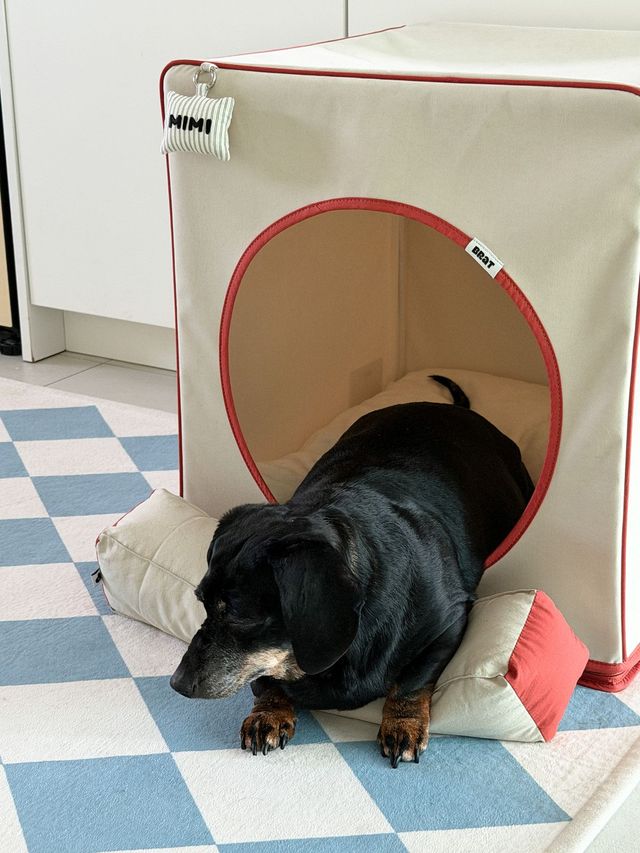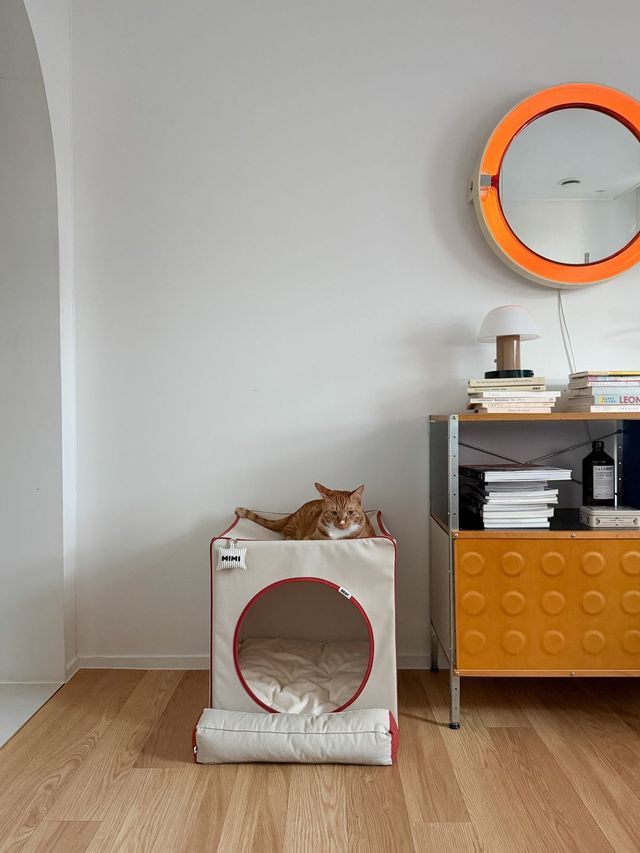 올데이브랫(ALLDAYBRAT)의 ‘ADB 하우스’. 숨숨집 겸 침대로 사용할 수 있는 제품이에요. 크기가 커서 강아지와 고양이 모두 잘 사용해요. 고양이들이 서로 들어가려고 할 때도 있습니다. 임스 스토리지 유닛 옆에 두었는데, 디자인이 단정해서 톤이 잘 맞아요.