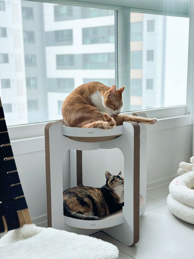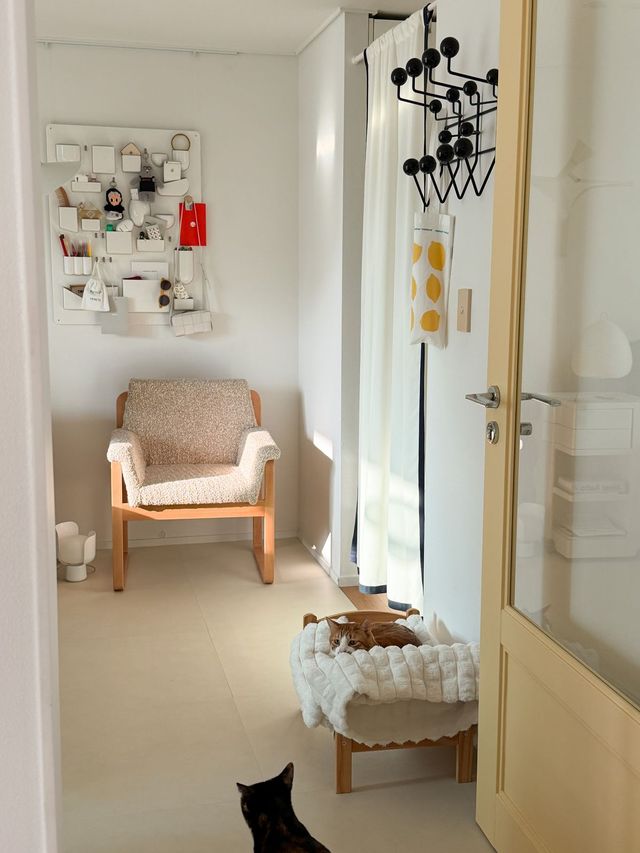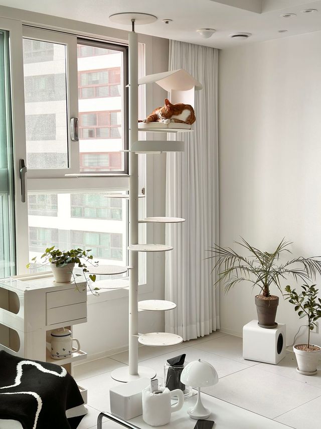 수직 공간이 필요한 고양이를 위해 거실과 복도, 안방 베란다에 캣타워를 두었어요. 특히 창이 탁 트여 있어서 고양이들이 좋아하는 안방 베란다 창가에는 캣타워 여러 개를 배치했습니다. 잘 보이지 않는 공간인 만큼 고양이들이 마음껏 놀 수 있도록 크게 고민하지 않았어요. 거실에 둔 캣타워는 디자인이 심플한 것으로 골라서 공간 분위기와 어울리도록 했죠.