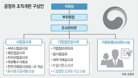 한편 관가 안팎에선 기업집단정보분석팀 외에도 심판관리관실 내 카르텔심판담당관, 시장감시국 내 전자거래감시과·표시광고감시팀, 카르텔조사국 내 서비스카르텔조사과, 가맹유통심의관 등이 신설될 가능성이 거론된다.