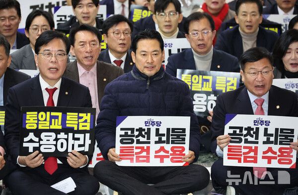 뉴시스 보도에 따르면, 송언석 원내대표를 비롯한 당 지도부와 의원들은 이날 오전 서울 종로구 청와대 사랑채 분수대 앞에서 '통일교 게이트·더불어민주당 공천뇌물 특검 촉구 규탄대회'를 진행한다.