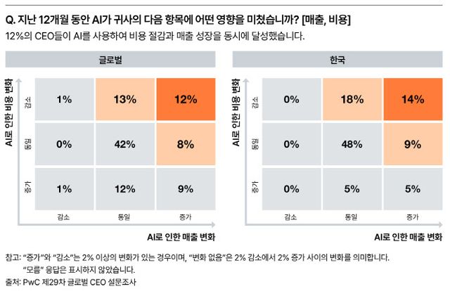 조사 결과 AI 투자 대비 실질적 성과를 거두는 기업은 소수에 그쳤다. 지난 1년 간 AI 도입을 통해 추가 매출을 창출했다고 응답한 CEO는 30%였으며, 비용 절감 효과를 본 기업은 26%로 집계됐다. 하지만 응답자의 22%는 오히려 비용이 늘었으며 절반이 넘는 56%의 CEO는 매출 증가나 비용 절감 효과를 전혀 체감하지 못했다고 답했다. 이 가운데 매출 증가와 비용 절감이라는 성과를 모두 거둔 기업은 전체의 12%에 불과했다. 한국은 이보다 소폭 높은 14%를 기록했다.