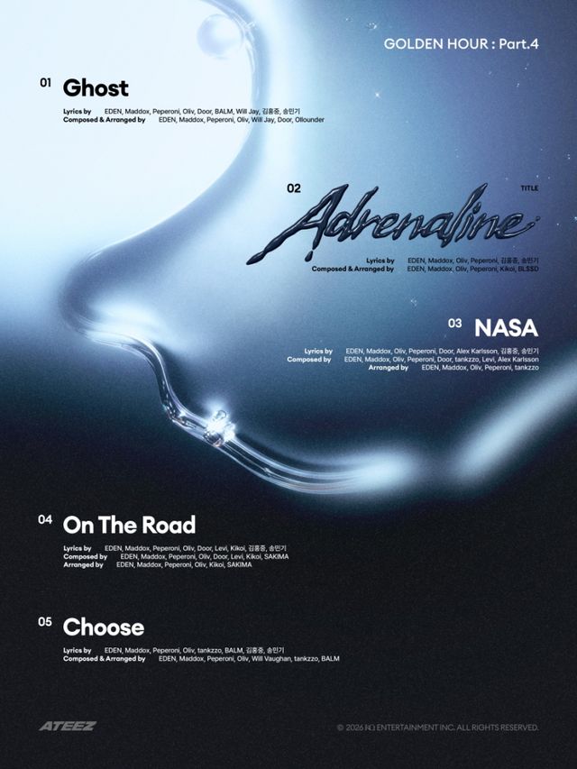 트랙리스트에 따르면 에이티즈의 새 앨범 타이틀곡은 ‘아드레날린’이다. 이 외에도 ‘고스트’, ‘나사’, ‘온 더 로드’, ‘츄즈’까지 총 다섯 곡이 수록돼 ‘골든 아워’ 시리즈의 빛나는 서사를 이어갈 예정이다.