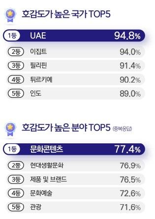한국에 대한 호감도가 가장 높은 나라는 '아랍에미리트(UAE)'가 94.8%로 1위로 꼽혔다. 이어 이집트(94.0%), 필리핀(91.4%), 튀르키예(90.2%), 인도(89.0%), 남아프리카공화국(88.8%) 등이 그 뒤를 이었다.