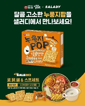 이번 프로모션은 샐러드를 즐기는 젊은 층에게 누룽지팝의 매력을 알리기 위해 기획했다. 신선한 샐러드에 식사 대용으로 적합한 누룽지팝을 더해, 맛과 식감을 모두 갖춘 한 끼 조합을 선보인다는 구상이다.