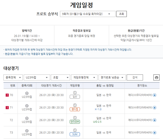 서울올림픽기념국민체육진흥공단(이사장 하형주)이 발행하는 체육진흥투표권 스포츠토토의 수탁사업자 한국스포츠레저㈜가 오는 1월 20일 오후 8시 30분에 제다(사우디아라비아)에서 열리는 2026 AFC U-23 아시안컵 4강 한국(원정)-일본(홈)전 경기를 대상으로 하는 프로토 승부식 9회차 게임이 마감을 앞두고 있다고 밝혔다.
