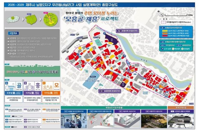 지난해 국토교통부의 '우리동네살리기 신규 공모사업'에 선정된 남문2지구에선 도시재생 기반을 구축하기 위한 사전 작업이 진행된다. 올해는 노후 주택 집수리 등을 위한 행정적 준비를 비롯해 주민 커뮤니티 센터인 '모흥마루', 마을 공원인 '모흥뜨락'을 갖추기 위한 실시설계가 이뤄진다. 남문2지구 사업은 '탐라국 발상지, 주민 모다정 누리는 모흥골 재흥'이라는 목표로 이도1동 1695-9 일대 약 6만9700㎡에서 추진되는 도시재생 사업이다.