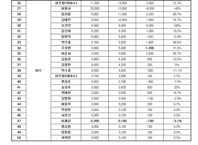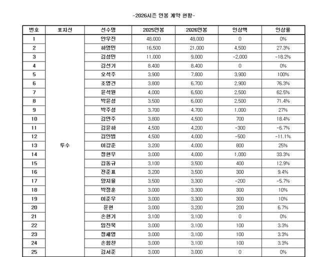 군 복무를 마치고 복귀하는 에이스 안우진은 전년과 동일한 4억8000만원에 계약하며 연봉 계약 대상자 중 최고 연봉자가 됐다. 이번 안우진의 연봉 2023시즌 종료 뒤 군 입대를 앞두고 체결했던 금액과 같다.