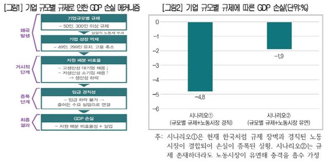 [이데일리 송재민 기자] 기업 규모에 따라 적용되는 차등 규제에 더해 경직된 노동시장이 맞물리면서 한국 경제의 성장 잠재력을 크게 훼손하고 있다는 분석이 나왔다. 이로 인한 국내총생산(GDP) 손실 규모는 연간 111조원에 달하는 것으로 추산됐다.