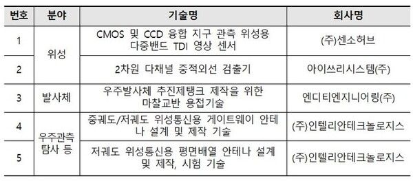 이번에 선정된 5개의 우주신기술은 위성 및 발사체 제작, 우주관측탐사 분야의 기술들이다. 고성능 영상 센서와 적외선 검출기, 발사체 추진제탱크 제작 공정, 차세대 위성통신 안테나 기술을 망라하고 있다.