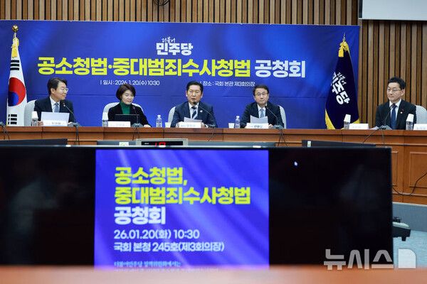 뉴시스 보도에 따르면, 더불어민주당이 20일 중대범죄수사청(중수청)·공소청 신설을 골자로 한 정부 검찰개혁안을 두고 공청회를 가졌다. 정청래 대표는 "민주주의 발전이라는 큰 물줄기 위에서 논의되고 시행될 것"이라며 수사·기소 분리 원칙을 재확인했다.