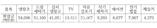 기후부는 이번 환급사업에 약 196만건(2624억원)이 접수돼 심사를 통해 부적정 신청, 환급금 과다산정 등 약 276억원을 걸러내고 약 185만건(2348억원)의 보조금을 환급했다. 주요 환급품목은 냉장고(540억 9600만원), 드럼세탁기(511억 6000만원), 김치냉장고(410억 51000만원), 텔레비전(286억 1200만원), 의류건조기(236억 6700만원) 순이었다.