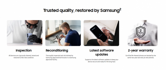 삼성전자는 CRN 제품을 신제품과 동일한 기준으로 관리한다. 내부와 외부 모든 부품을 전수 점검한 뒤 필요할 경우 정품 부품으로 교체하고, 147개 항목에 대한 품질 검사를 거쳐 공장 출고 수준으로 재정비한다. 이 과정에서 단말기 식별번호(IMEI)도 새롭게 부여돼 유통·보증 측면에서 신제품과 동일한 기준이 적용된다. 이에 따라 보증기한(2년)과 구매 후 기한 제한이 있는 삼성케어플러스 등도 신제품과 같은 조건으로 가입할 수 있다.