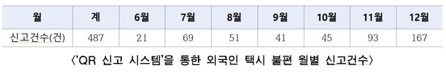 서울시는 지난해 6월부터 전국 최초로 ‘택시 QR 신고 시스템’을 운영하며 외국인 신고 건수가 급증했다고 밝혔다. 지난해 6월부터 12월까지 총 487건이 접수됐으며, 이 가운데 부당요금 신고가 가장 많았다. 신고가 사실로 확인되면 과태료를 부과하는 등 강력한 행정조치를 시행했으며, 실제 사례로 김포공항에서 연희동까지 운행한 한 택시기사는 미터기 요금 3만 2600원이 아니라 5만 6000원을 임의로 징수해 ‘부당요금 징수(임의요금)’로 처분됐다.
