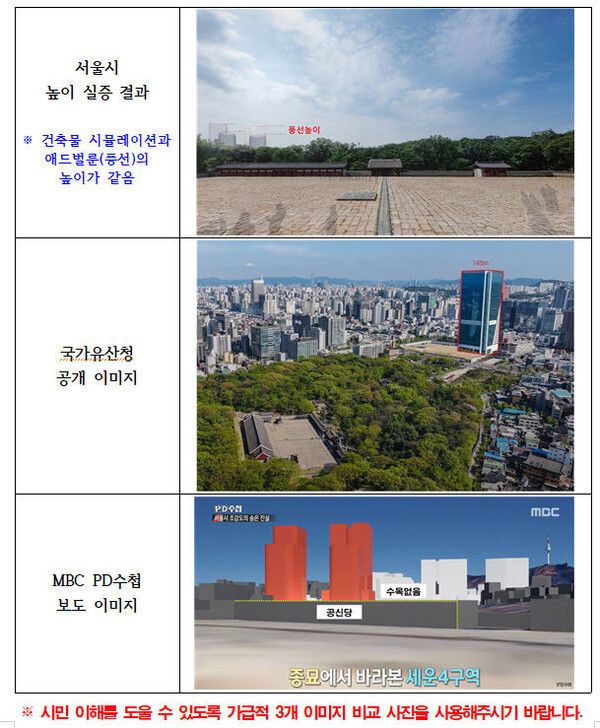 이민경 서울시 대변인은 20일 입장문에서 "국가유산청은 서울시의 객관적이고 공개적인 검증을 위한 공동 실측을 거부할 뿐만 아니라 세운4구역 건축물 높이 검증을 위해 건축물과 동일한 높이에 설치한 애드벌룬을 종묘에서 촬영하겠다는 서울시의 요청까지 불허했다"며 "이는 명백한 권한 남용"이라고 짚었다.
