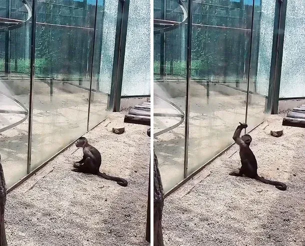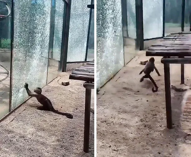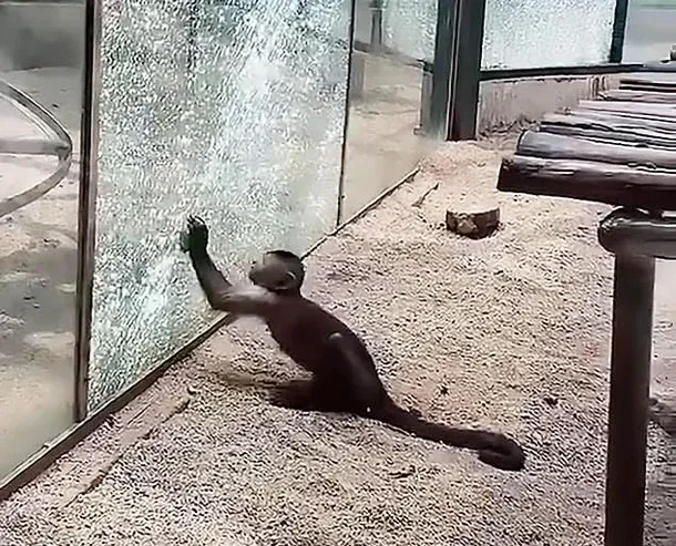 날카롭게 만든 석기로 동물원 유리창을 꺰