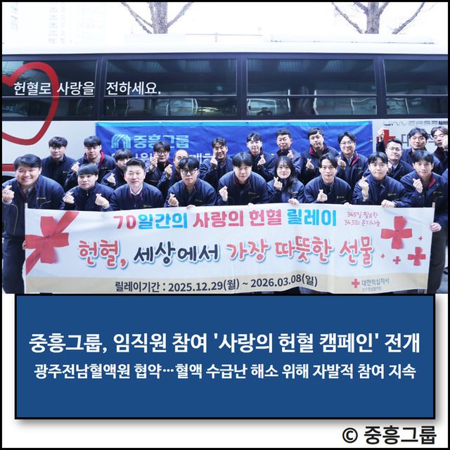 대한적십자 광주전남혈액원 관계자는 "동절기에 접어들면 헌혈 참여자들이 현저하게 줄어든다"라며 "이런 어려운 시기에 도움을 준 중흥그룹에 감사드린다"라고 말했다.