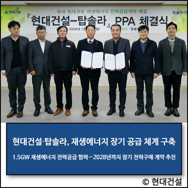 현대건설 관계자는 "이번 확약식은 태양광 중심의 국내 재생에너지 전력공급 시장 신뢰도와 성숙도를 높이고, 국내 기업에 안정적인 장기 전력공급이라는 실질적 해법을 제시한 모범적인 민간 협력 사례"라며 "현대건설과 탑솔라는 향후 재생에너지 개발, RE100 이행 지원 등 다양한 영역에서 협력을 확대해 국가 에너지 선진화를 선도해 나가겠다"라고 전했다.