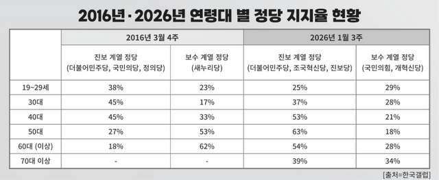 지금의 30대가 20대였던 10년 전 여론조사 결과는 지금과 크게 다르지 않았다. 약 10년 전인 2016년 3월 4주차 한국갤럽이 발표한 연령대별 정당 지지율 여론조사 결과에 따르면 18~29세 연령대의 진보 계열 정당(더불어민주당, 국민의당, 정의당) 지지율은 38%, 보수 계열 정당(새누리당) 지지율은 23% 등이었다. 과거와 현재를 비교했을 때 진보 계열 정당 지지율은 13%p 급락한 반면 보수 계열 정당 지지율은 6%p 상승했다. 최근 20대 청년 보수화 현상의 실체가 보수 지지 보단 진보 외면에 가깝다는 해석이 나오는 배경이다.