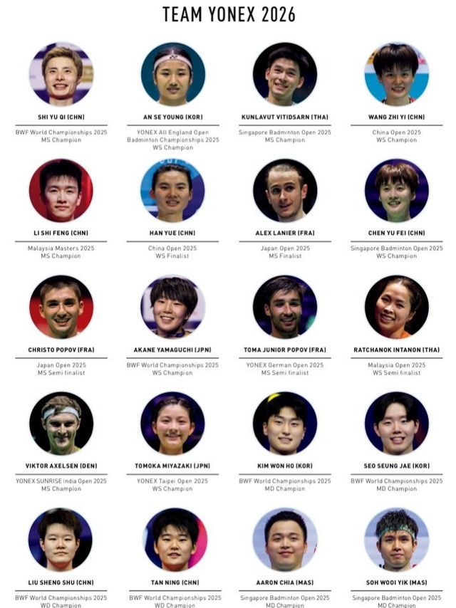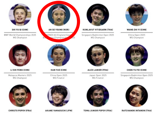 먼저 한국 배드민턴의 간판 안세영이 당당히 이름을 올렸다. 특히 안세영은 최근 해당 브랜와 4년 100억원이라는 파격적인 조건으로 재계약을 체결했다. 이번 라인업에도 최상단 한가운데에 자리잡았다. 2025년 전영 오픈 우승자라는 타이틀이 내걸렸다. 안세영이 지난해 따낸 11개 타이틀 중 가장 자랑스럽고 유명한 대회가 바로 전영 오픈이다.