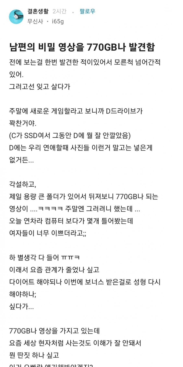 직장인 익명 커뮤니티 '블라인드'에 글을 올린 아내 A씨는 주말에 새로운 게임을 설치하려다 D드라이브가 꽉 찬 것을 보고 의아함을 느꼈습니다. 평소 연애 시절 사진 외에는 별다른 자료를 넣지 않는 곳이었기에 뒤져본 결과, 무려 770GB에 달하는 영상 폴더를 발견하게 되었습니다.