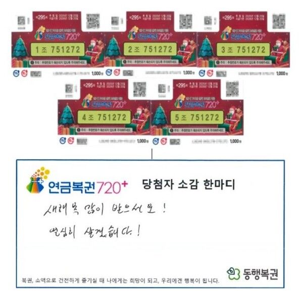 9일 동행복권에 따르면, 사연자 A씨는 대구광역시 달서구 대명천로의 한 복권 판매점에서 구매한 연금복권 720+ 제295회차에서 1등 1매와 2등 4매에 동시 당첨됐다.