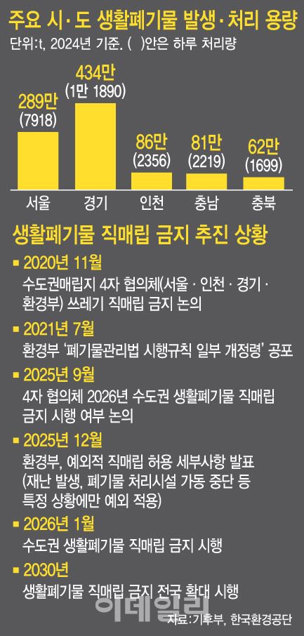 2021년 7월 당시 환경부(현 기후에너지환경부)는 폐기물관리법 시행규칙을 공포하면서 수도권은 2026년, 이외 지역은 2030년부터 생활폐기물 직매립을 금지토록 했다. 서울·인천·경기 등 수도권 3개 시·도는 제도 시행 전 자체적으로 쓰레기를 처리할 시설을 마련해야 했다. 하지만 지난달 기후부가 수도권 3개 시도 내 66개 기초지자체별로 생활폐기물 직매립금지를 위한 제도이행 준비를 점검한 결과 33개 기초지자체는 공공소각시설 용량이 부족해 민간위탁 처리가 필요한 처지였다. 법 공포 후 대안 없이 5년이란 준비시간을 흘려보낸 셈이다.