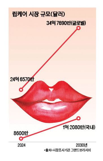 최근 입술 건강에 대한 관심이 높아지면서 립케어 시장도 성장세를 보이고 있다. 시장조사기관 그랜드뷰리서치에 따르면 2024년 기준 립케어 글로벌 시장 규모는 24억6570만 달러(약 3조6330억원)로 집계됐다. 연 평균 5.9% 성장해 2030년에는 34억7690만 달러(약 5조1240억원)까지 확대된다는 전망이다.