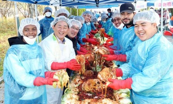 | 대전 서구가 와국인 유학생 30여명이 참여한 가운데 '김장 나눔' 행사를 하고있다. [사진제공=대전 서구] |