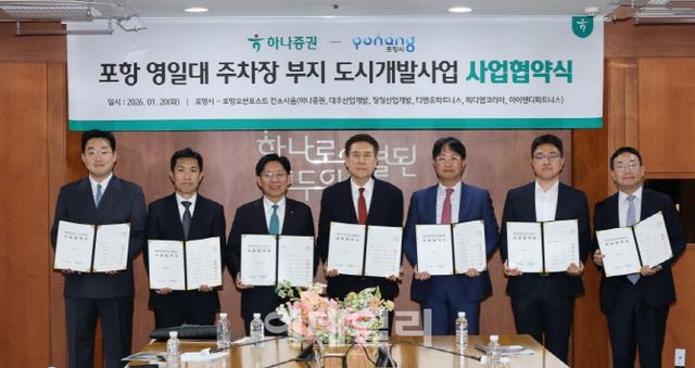 21일 포항시에 따르면 20일 서울 하나증권 본사에서 영일대해수욕장 공영주차장 부지를 활용한 도시개발사업협약을 체결했다고 밝혔다. 협약식에는 포항시 관계자들과 복합해양레저 관광도시 조성 사업 민간사업 참여자인 하나증권과 대우산업개발 등도 참석했다.