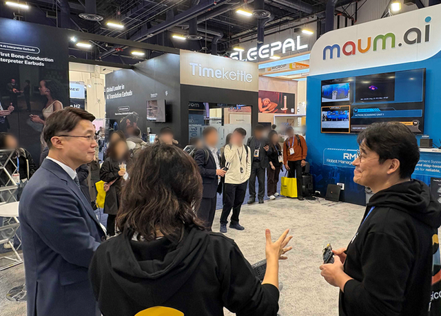'CES 2026' 참가 당시 과학기술정보통신부 류제명 제2차관(오른쪽)이 방문해 마음AI의 로봇시연을 보고 관심을 보이고 있는 모습. ⓒ 마음AI