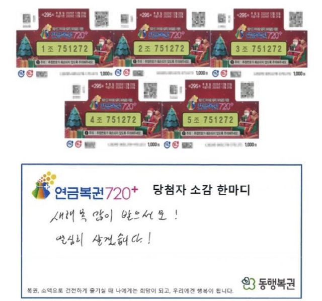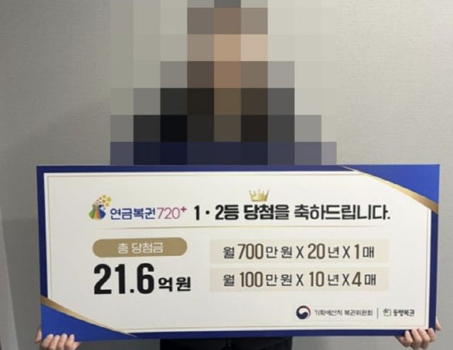 한편 연금복권 720+는 조 번호와 6자리 숫자를 포함한 총 7자리를 모두 맞혀야 1등에 당첨된다. 1등에 당첨될 경우 월 700만 원씩 20년 간 지급되고, 2등은 조 번호와 상관없이 6자리 숫자를 모두 맞히면 된다. 월 100만 원씩 10년 간 지급되므로 1·2등에 모두 당첨된 A씨의 총 수령액은 21억 6000만 원이다.