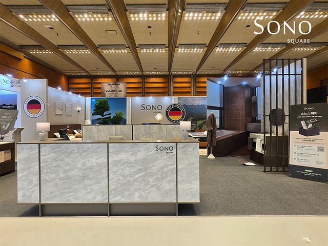 전시 부스는 실제 호텔 객실처럼 조성해 소노시즌의 주요 제품을 선보인다. 소노호텔앤리조트에 실제 납품되는 메모리폼 매트리스와 침구류를 배치해 방문객들이 직접 체험하고 상담과 구매까지 한 번에 진행할 수 있도록 구성했다.