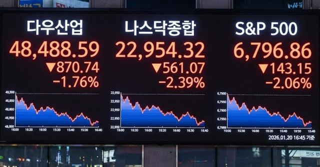 20일(현지시간) 뉴욕증권거래소에서 다우지수는 전 거래일 대비 870.74포인트(1.76%) 내린 48488.59에 거래를 마쳤다. 대형주 중심의 S&P500지수는 143.15포인트(2.06%) 하락한 6796.86을 기록하며 6800선이 붕괴됐다. 기술주 위주의 나스닥 지수는 낙폭이 더 컸다. 561.07포인트(2.39%) 밀린 22954.32로 장을 마감하며 3대 지수 모두 일제히 우하향 곡선을 그렸다.