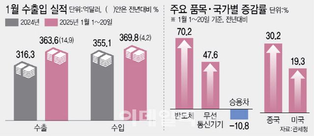 21일 관세청에 따르면 1월 1~20일 우리나라 수출액은 363억 6000만달러(약 53조 8000억원·통관기준 잠정)로 지난해 같은 기간보다 14.9% 늘었다. 1월 1~20일 기준으로는 역대 최대다.