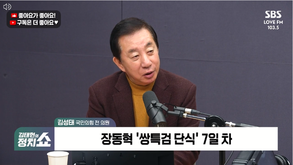 김성태 국민의힘 전 의원은 장동혁 대표가 쌍특검 수용을 요구하며 7일째 단식을 이어가고 있는 것에 대해 "단식에도 불구하고 여야 간 진영 갈등이 여전히 있다. 단식은 정치의 시간이기 때문에 당내 갈등, 진영 갈등 등 분열을 수습하는 계기가 돼야 한다"고 강조했다.