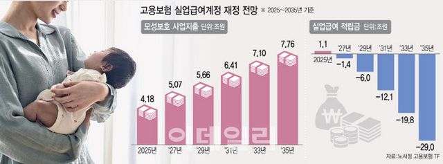 [세종=이데일리 서대웅 조민정 기자] 출산휴가·육아휴직급여 등 모성보호 사업에 들어가는 돈이 2035년 7조 7000억원에 달할 것으로 예측됐다. 수당 재원인 실업급여는 내년 ‘고갈’되고 2035년 누적 부족액은 29조원에 이를 것으로 전망됐다.