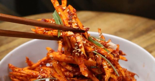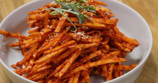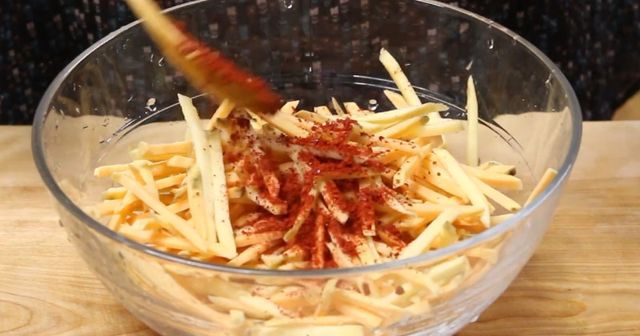 손질 과정도 단순하지만 요령이 있다. 고구마는 껍질을 벗긴 뒤 최대한 가늘게 채 썬다. 두께가 들쭉날쭉하면 식감이 균일하지 않다. 채 썬 고구마는 바로 찬물에 담가 전분을 일부 빼주는데, 너무 오래 담그면 고구마 특유의 고소함이 빠질 수 있어 5분 내외가 적당하다.