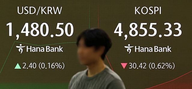 그린란드 사태 충격으로 미국 증시가 일제히 급락한 21일 오전 서울 중구 하나은행 본점 딜링룸 전광판에 코스피 지수가 표시되어 있다. 코스피 지수는 전 거래일 대비 1.57% 하락한 4808.94에 거래를 시작했다.