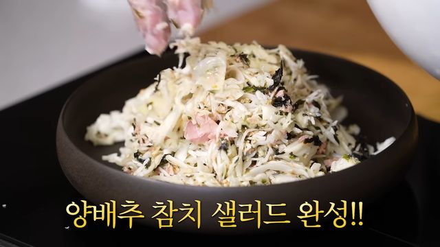 필요한 재료는 '양배추, 참치, 참치액, 들기름, 김자반, 깨'이다. 먼저 양배추를 준비해 채 썰어 그릇에 담는다. 다음으로 통조림 참치를 준비한다. 참치는 기름을 어느 정도 빼 준 뒤 양배추 위에 올린다. 참치에는 자체적인 간이 있어 다른 양념을 과하게 넣지 않아도 된다.