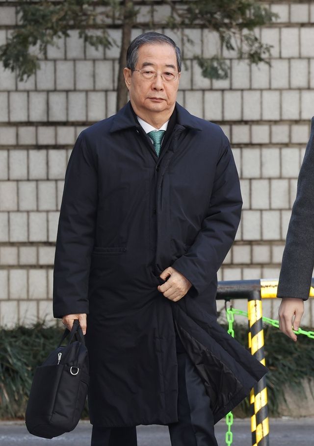 한덕수 전 국무총리가 21일 오후 서울 서초구 서울중앙지법에서 열린 내란 우두머리 방조, 내란 중요임무 종사 혐의 사건 1심 선고공판에 출석하고 있다. / 뉴스1